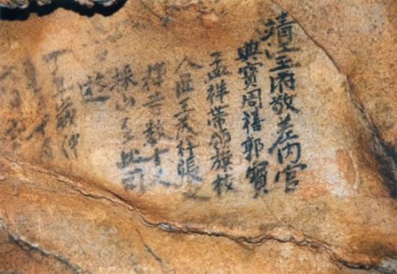 在蘆笛巖壁書中,保存比較完整、比較清晰是明代靖江王府采山隊的題名,是一件為人注重的文物。題筆寫道:“靖江王府敬差內(nèi)官典寶周禧、郭寶、孟祥帶領旗校人匠王茂祥、張文輝等數(shù)人十人采山至此,同游。丁丑歲仲夏月十有六日記。”