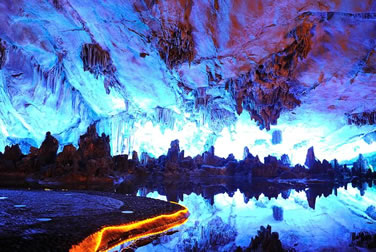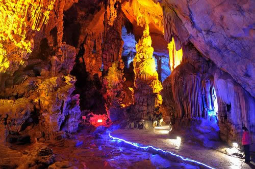 這些千姿百態(tài)的鐘乳石是由于地下水的作用,溶解了巖石中的碳酸鈣,再經(jīng)過上百萬年的沉淀堆積結晶而形成的,所有的景觀都是大自然鬼斧神工的杰作,沒有一點人工修飾,因此,蘆笛巖被譽為“大自然的藝術之宮”。