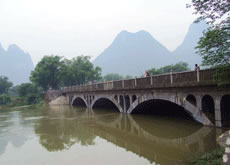 進入蘆笛景區(qū)首先見到的就是一座端莊古樸的石橋—飛鸞橋。飛鸞橋又名飛龍橋,位于桃花江與蘆笛路相交處。臨桂縣志載,宋紹定年間(1228-1233)建有5孔石橋,稱飛龍橋。明清均重修。雍正6年(1728年)邕人于必勝等捐資修建,有碑記。1941年秋毀于戰(zhàn)火。1944年地方人士募得糙米400余擔,重修成木板面橋。開發(fā)蘆笛巖后,于1964年改建成3孔石拱橋,1967年4月建成,同年5月驗收通車,當時稱“工農(nóng)橋”。