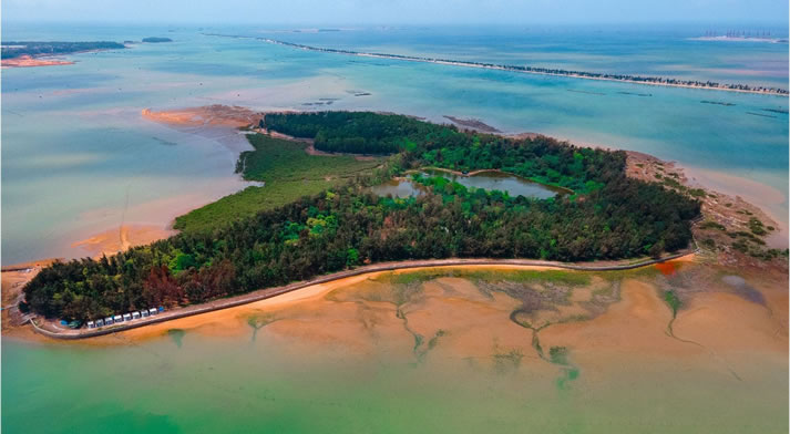 平山島,坐落在欽州城的南面,四面環(huán)水,與市區(qū)一水相隔土地平坦,林豐草茂,臨海的一面又突兀一座山峰,風(fēng)光旖旎,景色秀麗?滴鯉X標(biāo)準(zhǔn)海堤,全長(zhǎng)三十多千米, 號(hào)稱廣西第一堤,俗稱“海上長(zhǎng)城”。