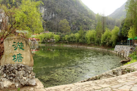 漩塘是國家級風景名勝區(qū),在龍宮的上游。一個面積達萬余平方米的圓塘,池水不借風力,日日夜夜、年年歲歲永不停歇地沿著順時針方向旋轉著。景象珍奇,令游客陶醉。通漩河的水流到這里便沉入地下,變?yōu)榈叵掳岛印L撩娉蕡A形,一年四季塘水以順時針方向,挾帶水上綠色浮萍不停地漩轉,終年不息。