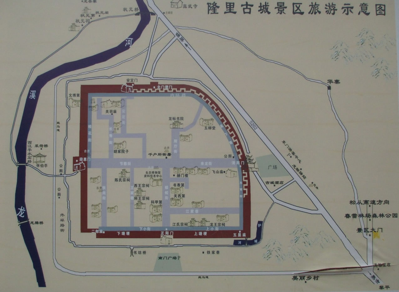 古城近似長(zhǎng)方形,南北寬217米,東西長(zhǎng)222米。城垣始建為泥土夯筑,天順元年(1457年)改以卵石框邊。周長(zhǎng)1500米,城墻高一丈二尺,壕深一丈。 城周三里三分,東南西北各設(shè)炮臺(tái)一座。全城設(shè)東南西北四道城門(mén),東門(mén)為清陽(yáng)門(mén),又名戌門(mén),門(mén)上建有三層高戌樓。東門(mén)主要是作為官員、軍隊(duì)等進(jìn)城之門(mén),取“紫氣東來(lái)”之意。南門(mén)為正陽(yáng)門(mén),西門(mén)稱(chēng)迎恩門(mén),除了門(mén)上建有兩層戌樓外,還設(shè)置了內(nèi)外兩道城門(mén),即在門(mén)洞前筑有一堵圍墻,出門(mén)洞后需轉(zhuǎn)九十度彎再出一道門(mén)才能到達(dá)城外。這結(jié)構(gòu)被隆里人稱(chēng)為“勒馬回頭”。古語(yǔ)中“北”、“敗”音相近意可互通,而“敗”字無(wú)疑犯了兵家之大忌,故北門(mén)常年閉門(mén)不開(kāi),且為取其藏風(fēng)聚氣之說(shuō),在北門(mén)上城樓上設(shè)有寺廟,供奉有菩薩,以祈求平安。城墻上設(shè)有跑馬道,城壁設(shè)有“天燈座”,用以傳遞訊息。古城墻外有護(hù)城河,以防敵人侵襲。