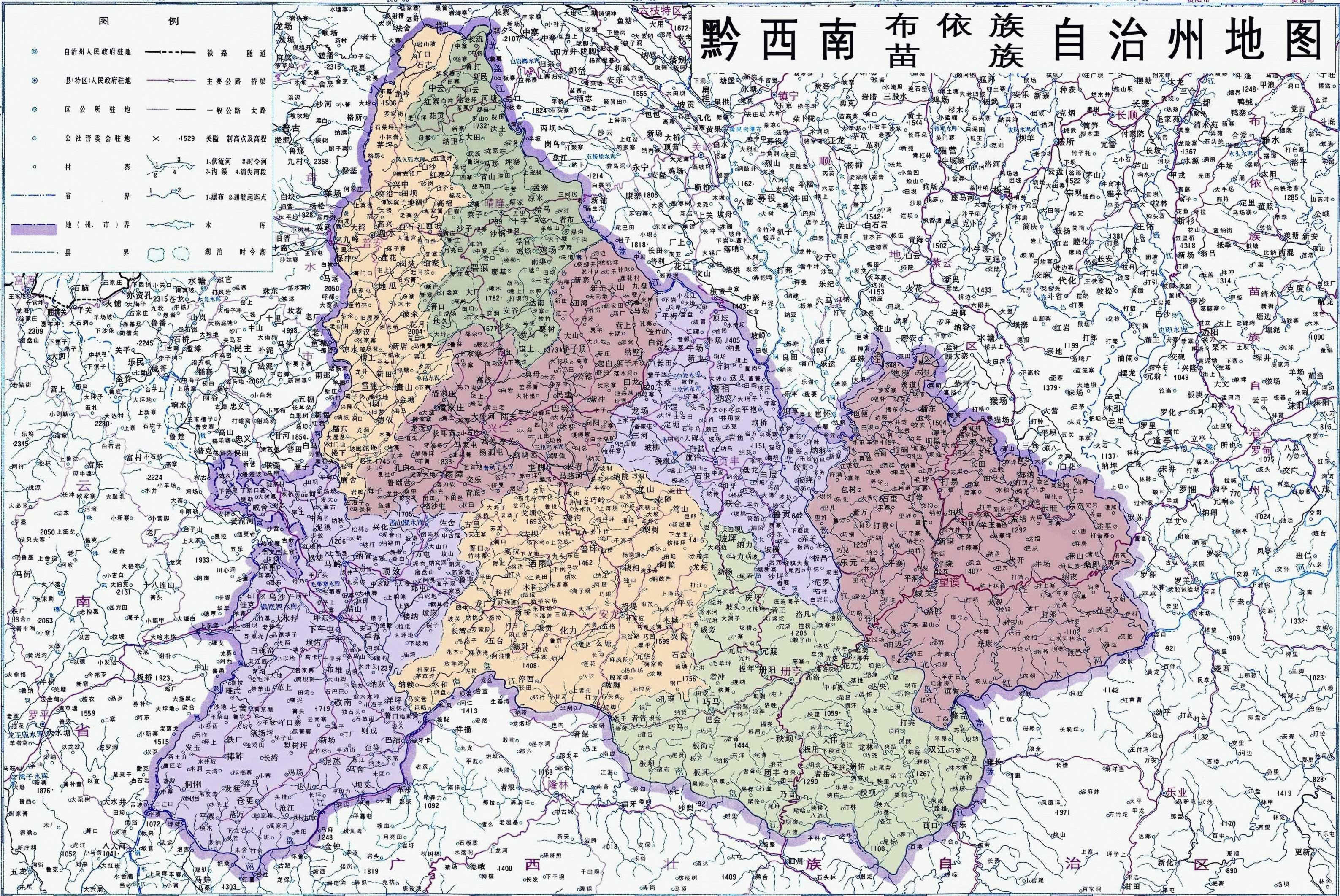 黔西南布依族苗族自治州位于滇黔桂三。▍^(qū))結(jié)合部,貴州省西南部、云貴高原東南端。東西長210千米,南北寬177千米;東與黔南布依族苗族自治州羅甸縣接壤,南與廣西隆林、田林、樂業(yè)3個縣隔江相望,西與云南省富源縣、羅平縣和六盤水市盤州市毗鄰。全州總面積16804平方千米。