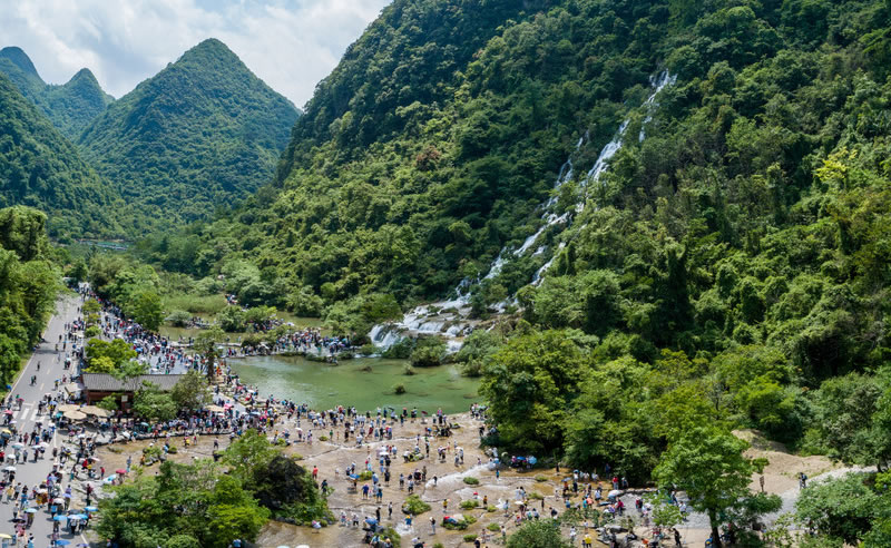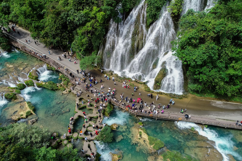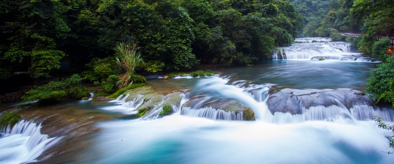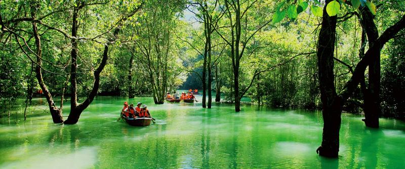 水上森林,長約600米,分上下兩段。河谷里叢生著茂密的喬木和灌木,形成一道翡翠屏障。清澈的河水從河床的雜木林中穿涌而下。年復(fù)一年,日復(fù)一日的沖涮,河床已沒有了一粒泥沙,連磐石也被激流磨光了棱角而變得“圓滑”,樹木卻扎根在河床里,紋絲不動,四季常青。是“水在石上淌,樹在水中長”的奇景。