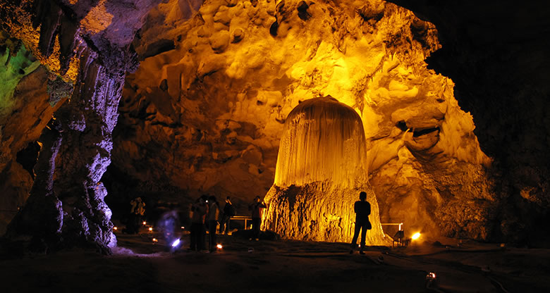天鐘洞長二千公尺,洞廳高大,廓道迂回。鈣化堆積物發(fā)育良好,形態(tài)逼真生動,且洞內(nèi)道路平坦,可觀性強(qiáng)。洞內(nèi)鐘乳石多酷肖動物,有鱷魚廳,金雞廳、百獸廳和犀牛廳等。