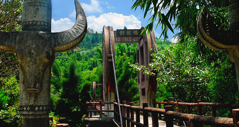 橋長126米,凈跨60米,寬2.4米,高25米,橋身兩端采用瑤山瑤族銅鼓造型,瑤族將銅鼓視為神賜之物,鎮(zhèn)寨之寶,是權(quán)力的象征。橋頭設(shè)立的圖騰柱代表著瑤族的尊嚴(yán)和崇拜,柱身上的浮雕圖案展示了瑤族傳統(tǒng)、獨(dú)特而古老的民族文化,具有濃郁的地方民族特色。