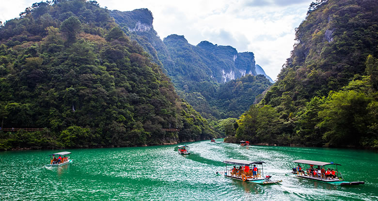 乘橡皮舟順?biāo)従彾拢瑑砂妒鞘[茸秀麗的喀斯特原始植被,幽靜的河水中,時而有魚兒躍起,時而有秀美島嶼出現(xiàn),宛如精巧的天然盆景。山水含情天做媒,帶著情侶竊竊私語,帶著老伴同舟共濟(jì),帶著朋友戲水歡歌。