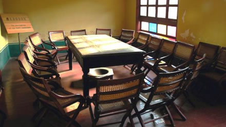 原為房主的小客廳。 會議室呈長方形,面積27平方米,室內(nèi)陳設(shè),基本上是當(dāng)年開會時的原貌。屋子正中的頂壁上懸掛著一盞荷葉邊蓋的洋員燈,屋子的東壁有一只掛鐘(原物)和兩個壁柜(原物),其中一個壁柜上嵌著一面穿衣鏡。西壁是一排軒亮的玻璃窗。屋子中央陳列著一張板栗色的長方桌(原物),四周圍著一圈木邊藤心摺疊靠背椅,共20只,為出席遵義會議的人員所坐。長方桌下有一只燒木炭的火盆,為當(dāng)時取暖用。