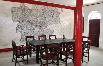 軍委總司令辦公室(作戰(zhàn)室)在遵義會議會議室正對的樓下,面積為56平方米,兩間長方形的房間組成,中間布一道可折疊的六合門。屋子正中陳列著兩張黑漆大方桌,桌上有鐵座馬煙、訂書機、中華蘇維埃共和國革命軍事委員會信 、報紙做的信封、30年代商務(wù)印書館出版的中國分省地圖冊以及《陳中日記》等。屋子的西窗下陳列著兩張三屈桌,桌上置西部皮包電話機,桌下立著線拐子。東窗下陳列著一對灰褐色的鐵皮公文挑箱。北壁上陳列著一幅巨大的云、貴、川三省接壤地區(qū)的軍用地圖,當(dāng)年軍委副主席周恩來、紅軍總司令朱德、總參謀長劉伯承等經(jīng)常在這里辦公。
