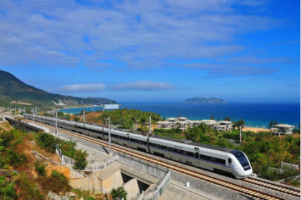 環(huán)島鐵路:海南環(huán)島鐵路由海南東環(huán)鐵路和海南西環(huán)鐵路組成,連接海口至三亞,東環(huán)308千米,西環(huán)345千米,主要運(yùn)行動車組,是全球首條環(huán)島高鐵。它的建成,將有利于優(yōu)化產(chǎn)業(yè)布局,帶動縣域經(jīng)濟(jì)協(xié)調(diào)發(fā)展;高鐵牽引動力為電力,沒有廢氣排放,能源消費(fèi)量低,對海南建設(shè)生態(tài)省和節(jié)約型社會將發(fā)揮積極作用;大大完善海南旅游基礎(chǔ)設(shè)施,滿足海南國際旅游島不斷增長的運(yùn)輸需求,為海南建成世界級海島休閑度假旅游勝地提供有力支撐。