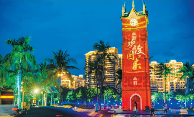 鐘樓為海口市的地標(biāo)建筑之一,位于長(zhǎng)堤路長(zhǎng)堤灘公園(?趦和珗@),占地16平方米,建于民國(guó)十八年(1929年),屬于混合結(jié)構(gòu),高5層,墻體用紅磚砌成,白石灰勾縫,頂端周?chē)仓?支箭尖角。大鐘設(shè)置在五樓,四面安裝七塊厚二厘米的大理石,構(gòu)成直徑兩米的鐘面,鐘時(shí)刻在大理石上,并嵌上鉛牌,涂以黑色。具有歐洲哥特式建筑風(fēng)格,景致幽雅。原址在本區(qū)中山橫路,后因城市擴(kuò)建遷于此地按原貌重建。
