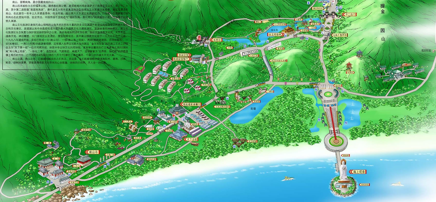 三亞南山風(fēng)景區(qū)是國(guó)家旅游局確定的“中國(guó)旅游業(yè)發(fā)展優(yōu)先項(xiàng)目”。它位于中國(guó)唯一的熱帶濱海城市三亞市的西部,是全國(guó)罕見(jiàn)的超大型文化和生態(tài)旅游園區(qū)。園區(qū)規(guī)劃面積五十平方公里,其中海域面積十多平方公里,由美國(guó)紐約國(guó)際城市設(shè)計(jì)公司統(tǒng)籌規(guī)劃,美國(guó)經(jīng)濟(jì)咨詢聯(lián)合公司提供可行性報(bào)告。項(xiàng)目?jī)?nèi)容策劃分別由中國(guó)佛教文化研究所、中國(guó)民俗學(xué)會(huì)、中國(guó)歷史博物館、中央民族大學(xué)、中國(guó)環(huán)境科學(xué)院、中國(guó)科學(xué)院生態(tài)中心完成。該項(xiàng)目是海南省的重點(diǎn)建設(shè)項(xiàng)目,同時(shí)被三亞南山風(fēng)景區(qū)是國(guó)家旅游局確定的“中國(guó)旅游業(yè)發(fā)展優(yōu)先項(xiàng)目”。它位于中國(guó)唯一的熱帶濱海城市三亞市的西部,是全國(guó)罕見(jiàn)的超大型文化和生態(tài)旅游園區(qū)。園區(qū)規(guī)劃面積五十平方公里,其中海域面積十多平方公里,由美國(guó)紐約國(guó)際城市設(shè)計(jì)公司統(tǒng)籌規(guī)劃,美國(guó)經(jīng)濟(jì)咨詢聯(lián)合公司提供可行性報(bào)告。項(xiàng)目?jī)?nèi)容策劃分別由中國(guó)佛教文化研究所、中國(guó)民俗學(xué)會(huì)、中國(guó)歷史博物館、中央民族大學(xué)、中國(guó)環(huán)境科學(xué)院、中國(guó)科學(xué)院生態(tài)中心完成。該項(xiàng)目是海南省的重點(diǎn)建設(shè)項(xiàng)目,同時(shí)被海南省授予“海南省生態(tài)建設(shè)示范工程”、“海南省生態(tài)旅游示范景區(qū)”,并得到了中央有關(guān)部門、佛教界、文化界的高度重視。它的建成填補(bǔ)了海南歷史文化旅游的空白,進(jìn)一步突出海南大生態(tài)旅游優(yōu)勢(shì),為中國(guó)旅游添光增彩。