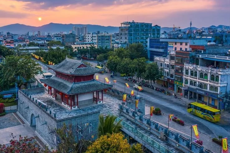 崖州古城,即現(xiàn)海南省三亞市崖城鎮(zhèn),位于三亞市西40多公里處,自南北朝起建制崖州,宋朝以來歷代的州、郡、縣治均設(shè)在這里。今天的崖城,以其悠久的歷史和繁多的名勝古跡而成為海南旅游勝地。 海南建省辦大特區(qū)后,崖州城的城門已修繕一新,顯得雄偉壯觀,中外游客川流不息。在崖城還有聞名海內(nèi)外的風(fēng)景區(qū)大小洞天,其形如巨鰲,枕海壁立,峰巒竟秀,林木重疊,山奇石怪,千姿百態(tài),綠榕垂蔭,紅豆如星,泉清似醴。