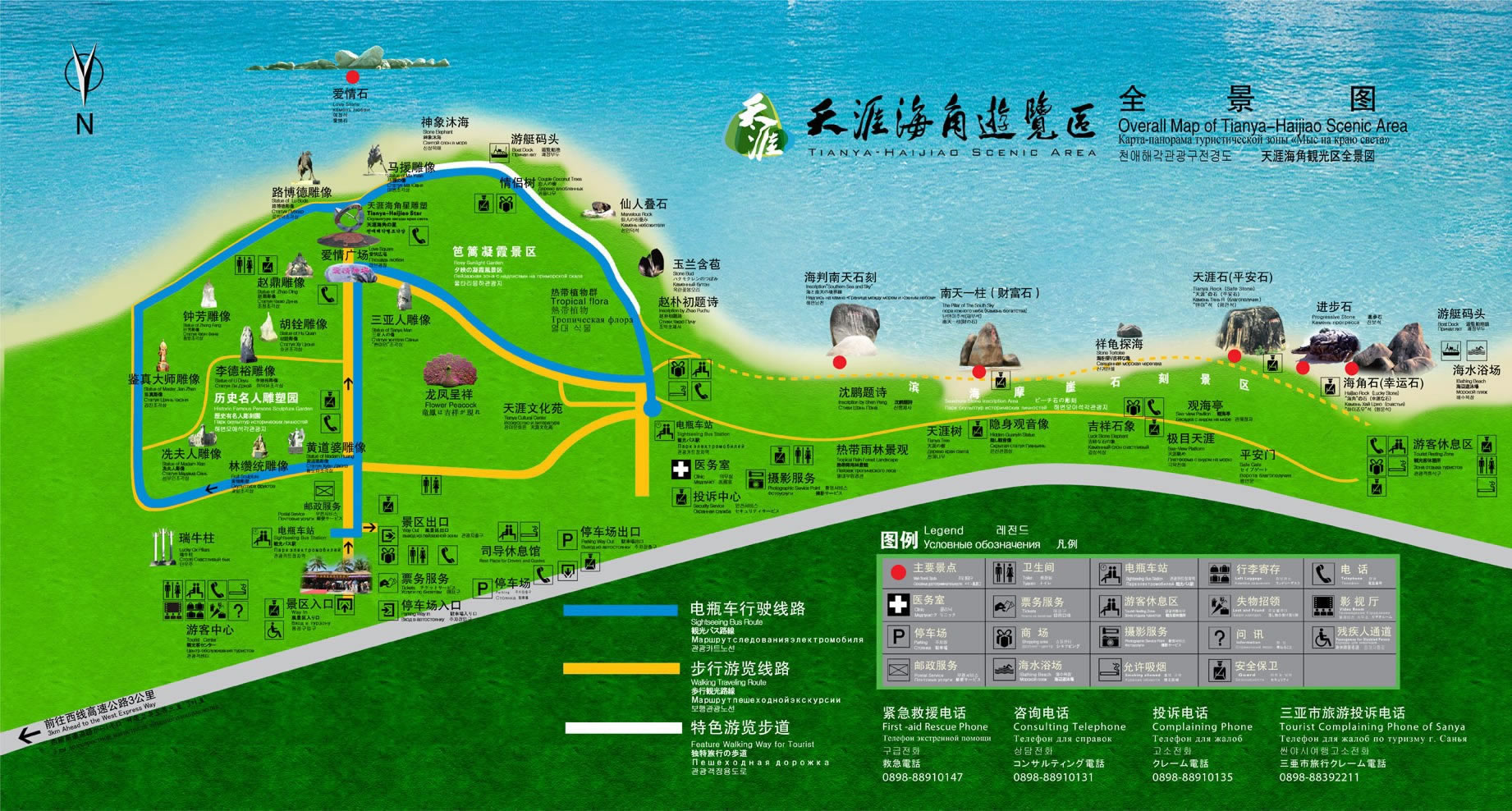 2、步行游覽線路:從大門口環(huán)繞歷史名人雕塑園游覽一圈,然后沿著海濱特色游覽步道行走,游覽笆籬凝霞景區(qū),欣賞熱帶植物群,繼續(xù)沿著步道走,游覽熱帶雨林景觀、天涯樹(shù)、隱身觀音像,到海邊觀看摩崖石刻群,然后原路返回,在電瓶車重點(diǎn)站處走天涯路步道,參觀天涯文化苑,然后經(jīng)三亞人雕像到愛(ài)情廣場(chǎng),沿主干道到景區(qū)出口。 |