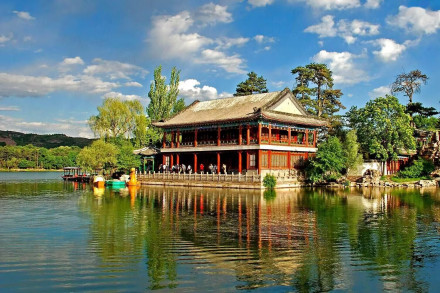 湖泊區(qū):苑景區(qū)的精華基本上在湖泊區(qū),康熙曾夸耀說,“天然風景勝西湖”。由于洲島錯落,湖面被長堤和洲島分割成5個湖,各湖之間又有橋相通,兩岸綠樹成蔭,山莊主要的風景建筑又都散落在湖區(qū)的周圍,因此顯得曲折有致,秀麗多姿。湖泊區(qū)位于山莊東南,面積49.6萬平方米。有大小湖泊八處,即西湖、澄湖、如意泅、上湖、下湖、銀湖、鏡湖及半月湖,統(tǒng)稱為塞湖。 湖區(qū)的風景建筑大多是仿照江南的名勝建造的,如“煙雨樓”,是模仿浙江嘉興南湖煙雨樓的形狀修的。金山島的布局仿自江蘇鎮(zhèn)江金山。湖中的兩個島分別有兩組建筑,一組叫“如意洲”,一組叫“月色江聲”!叭缫庵蕖鄙嫌屑偕健鐾、殿堂、廟宇、水池等建筑,布局巧妙,是風景區(qū)的中心。“月色江聲”是由一座精致的四合院和幾座亭、堂組成。每當月上東山的夜晚,蛟潔的月光,映照著平靜的湖水,山莊內(nèi)萬籟俱寂,只有湖水在輕拍堤岸,發(fā)出悅耳的聲音,“月色江聲”的題名便是由此而來。湖泊區(qū)集南方園林之秀和北方園林之雄,將江南園林的景觀移植到塞外。區(qū)內(nèi)湖泊總稱“塞湖”,總面積57公頃。