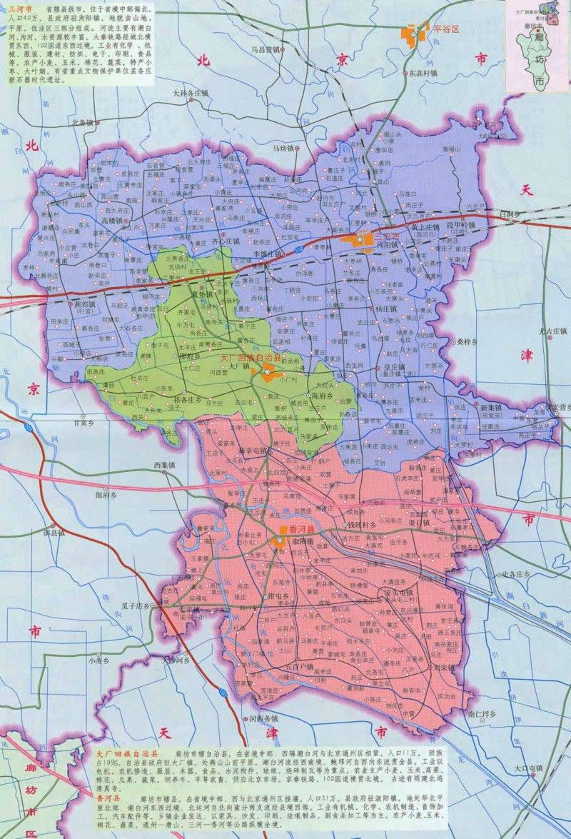 1993年經國務院批準撤縣設市,現(xiàn)轄10鎮(zhèn)2區(qū)(燕郊省級經濟技術開發(fā)區(qū)、省級農業(yè)高新技術園區(qū))、2個街道辦事處、395個村街。