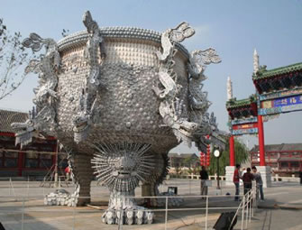 九龍鼎采用杯、羹、匙、盅、盤、碟、碗等青花玲瓏瓷具近4萬件,鼎高和直徑均為6米,最大處直徑10米,通過資深彩燈匠人利用棉線,親手捆扎手工編織而成。各類瓷器都按照設(shè)計圖紙標(biāo)準(zhǔn)施工,制作工藝精巧、制作過程嚴(yán)謹。主體為鋼結(jié)構(gòu),整體外光源,龍頭有LED追光變幻和噴霧效果。其創(chuàng)意深邃,規(guī);趾,構(gòu)思巧妙、制作精致、氣勢磅礴,既露王者風(fēng)范又顯民俗特色。