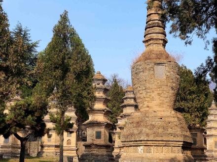 少林寺塔林位于少林寺西300米處,占地面積14000余平方米,是中國現(xiàn)存規(guī)模最大、數(shù)量最多的古塔建筑群,F(xiàn)存有唐、五代、宋、金、元、明、清7個朝代的磚石墓塔241座。因塔累繁多,大小參差、高低不同,粗細(xì)不一,形狀各異,排列散亂,看似茂林,故被稱為“塔林”,少林寺塔林集古代磚石建筑、雕刻、書法、繪畫藝術(shù)之大成,被專家學(xué)者譽為是“古塔藝術(shù)博物館”。