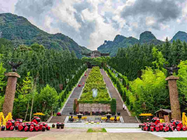 炎帝神農(nóng)文化園位于木魚鎮(zhèn)南部209國道旁,是集中展示神農(nóng)始祖業(yè)績與功德,并集珍稀古老自然孑遺樹種及科研為一體的突出尋根祭祖為主題的文化旅游區(qū)。四周群峰爭奇,納群山之靈氣,容百川之秀麗。2002年通過國家質(zhì)量ISO9001和ISO 14000體系認證,被評為國家4A級景區(qū)。景區(qū)有特色地分為四個部分:古老植物園、千年杉王、神農(nóng)祭壇、購物長廊。祭壇內(nèi)神農(nóng)塑像高大雄偉,莊嚴肅穆,雙目微閉,似乎在洞察世間萬物。它以大地為身軀,頭像高21米,象征中華民族在21世紀蒸蒸日上,寬35米,與它的高加起來共56米,象征著56個民族的大團結(jié)。祭壇外圍的五色石代表著五行,即金、木、水、火、土,內(nèi)方外圓,即有天圓地方之意。祭壇的兩側(cè)用八組壁畫記錄著遠古神農(nóng)氏的功德,即降牛以耕、焦尾五弦、積麻衣葛、陶石木具、原始農(nóng)耕、日中為市、穿井灌溉。八組壁畫以藝術(shù)的手法敘述了神農(nóng)氏的豐功偉業(yè),表達了子孫們的無限追戀。