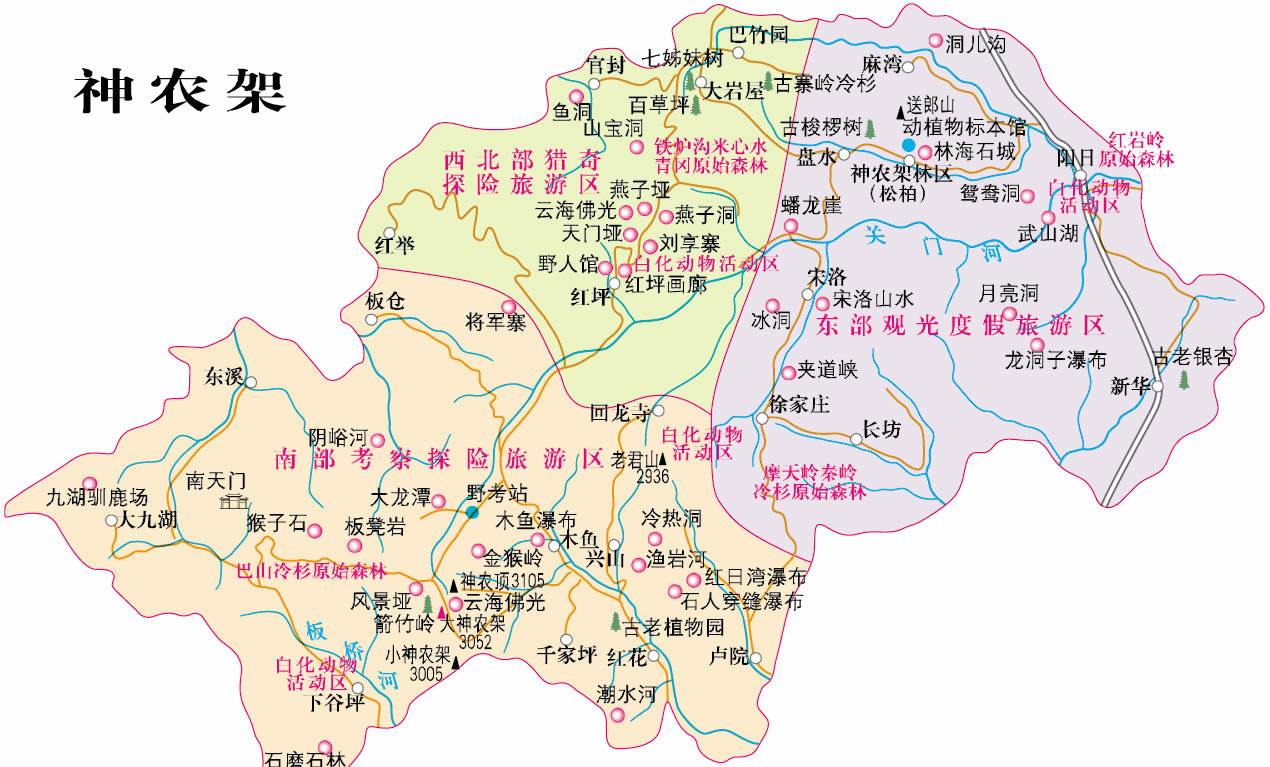 神農(nóng)架是位于湖北省西部一片群峰聳立的高大山地,橫亙于長江、漢水之間,方圓3250平方公里,相傳因上古的神農(nóng)氏在此搭架上山采藥而得名。景區(qū)山峰均在海拔3010米以上,堪稱“華中屋脊”。是以秀綠的亞高山自然風(fēng)光,多樣的動植物種,人與自然和諧共存為主題的森林生態(tài)旅游區(qū)。 神農(nóng)架主要景點有神農(nóng)頂、風(fēng)景埡、板壁巖、瞭望塔、小龍?zhí)、大龍(zhí)、金猴嶺等,以原始、神秘聞名于世,區(qū)內(nèi)山高谷深,林木茂密,氣候復(fù)雜多變,四季景色迷人。獨特的自然環(huán)境、人文歷史,造就了極其豐富、珍貴的自然和人文景觀,也孕育了景色宜人、鐘靈毓秀的旅游環(huán)境,有“神農(nóng)天園”之稱。