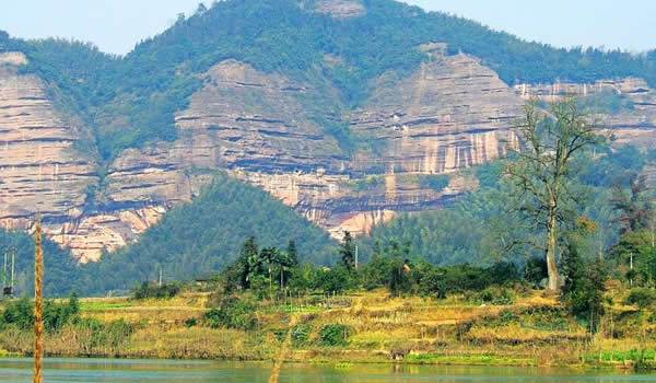 銅梁山位于湘潭縣石鼓鎮(zhèn)境內(nèi),山脈海拔700多米,地勢極為偏僻,正好處于湘潭縣與雙峰縣的交界之處。銅梁山名稱由來還有個(gè)美麗的傳說。在雙峰縣井字鎮(zhèn)與湘潭縣、湘鄉(xiāng)市交界處,有一座大山叫昌山。主峰靈應(yīng)峰海拔755.1米,是南岳72峰之一。在主峰與鷹尖石之間,橫臥著一條長達(dá)2公里的一字形平脊嶺,當(dāng)?shù)厝私兴?ldquo;一字大脊”。相傳有一仙人挑著兩個(gè)大小不一的籮筐,掌燈時(shí)分就來到了大山腳下的花山村。熱情好客的花山人見了這位外來客人,格外歡喜,他們以美酒佳肴相陪,不知不覺已到雞鳴。仙人突然想起師父“雞鳴前一定要翻過大山”的教誨,趲告辭,挑起擔(dān)子飛也似的上山去?墒,送客的花山人一會兒便發(fā)現(xiàn),那人的擔(dān)子擱在了山頂,扁擔(dān)成了一條“一字脊”,兩個(gè)籮筐便成了一字脊兩端的“巒柱”,形似一個(gè)巨大的銅梁。因此,銅梁山這個(gè)美名便叫開了。