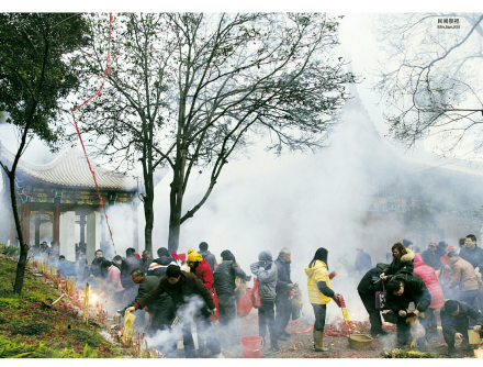 炎帝陵民間祭祀以告祭為主。祭祀時間多選在每月的初一、十五以及各種節(jié)令、節(jié)慶。此外,每逢炎帝生辰日(農歷四月二十六日),炎陵方圓幾百里的群眾都會匯集于炎帝陵,祭祀炎帝,祈福求平安。民間祭祀儀式有墓前牲祭、上香敬供、跪拜祈福、許愿求應、還愿祭拜等等。每年正月,各地民眾爭相在炎帝陵宰殺牲畜,供上果品、美酒,向始祖行三拜九叩之禮,獻香燃炮,傳說這樣就能得到始祖庇佑,一年順順利利,所以每年正月炎帝陵香火尤為旺盛。民間祭祀對祭時、禮程亦十分講究,通常拜祭始祖前都會洗梳干凈,行跪拜叩首之拜之祭過炎帝后,將自己的心愿和所求寫于帛或紙是,用線系于小石子等重物一端,拋掛于炎帝陵內的古樹上,祈求炎帝保佑愿望實現。