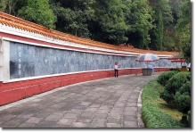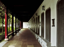 御碑園位于炎帝墓冢之后,坐落炎帝陵殿中軸線之北,大殿后墓碑亭兩側有拱門道路可通。園長100米,面積6400平方米,建筑面積280平方米。東西碑廊各長40米。廊壁刊歷代御祭文碑51塊(其中明代13塊,清代38塊),另刊宋、明、清及控記事文碑5塊。東西碑廓之間有九鼎臺,臺上列石鼎9只,每只高1.5米,重1.11噸,象征國家統一,金甌無缺。園北面是弧形照壁,鑲石刻壁畫《神農功績圖》。壁畫長40米,高1.5米,由228塊正方形粗磨青石板鑲成,壁畫以炎帝功績?yōu)橹黝},以原始先民從漁獵到農耕,從穴處到定居這一歷史性轉變時期的生產和生活為背景,采用線雕手法制作而成,生動形象地表現了炎帝勇于開拓、敢于創(chuàng)新、樂于奉獻的偉大實踐和高尚精神。