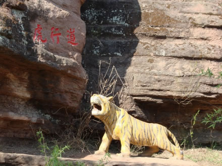 位于虎山東麓的五蓮池澗谷口。巨大的赤色崖壁上,有一天然凹洞,俗稱老虎窩。據(jù)說40年前虎窩內(nèi)可坐4人打牌,后來因有人在窩上方開山炸石才破壞了景點的原貌,如今仍見一淺洞。