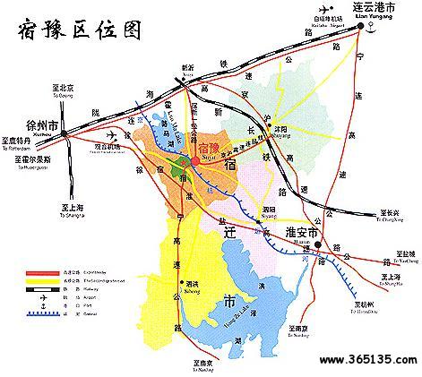宿豫區(qū)環(huán)抱宿遷市,與徐州、連云港、淮安三市相距均在100公里左右,水陸空交通便捷。公路方面:寧宿徐、徐宿淮鹽、宿新(在建)等兩條高速公路和宿新、宿沭兩條一級公路穿境而過,東距京滬高速公路55公里,距南京260公里,離上海380公里。鐵路方面:北距隴海鐵路新沂站、東離新長鐵路沭陽站均在50公里左右,淮(安)宿(遷)宿(州)鐵路(在建中)。水運方面:黃金水道京杭大運河縱貫南北,東距連云港港口120公里。空運方面:西距徐州觀音機場60公里,北到連云港白塔埠機場110公里。