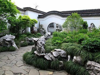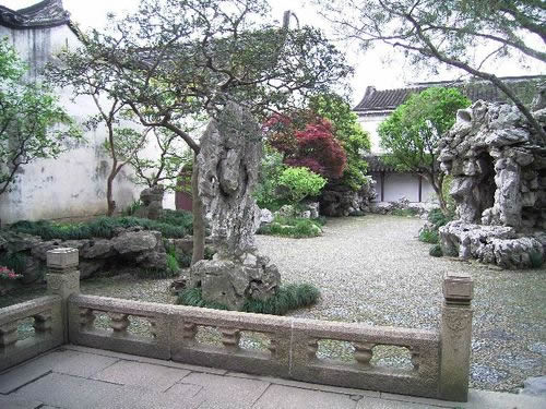 網師園分三部分,境界各異。東部為住宅,中部為主園。網師園按石質分區(qū)使用,主園池區(qū)用黃石,其他庭用湖石,不相混雜。突出以水為中心,環(huán)池亭閣也山水錯落映襯。西部為內園(風園),占地約1畝。北側小軒三間,名“殿春簃”。軒北略置湖石,配以梅、竹、芭蕉成竹石小景。軒西側套室原為著名畫家張大千及其兄弟張善孖的畫室“大風堂”庭院假山,采用周邊假山布局,東墻峰洞假山圍成弧形花臺,松楓參差。南面曲折蜿蜒的花臺,穿插峰石,借白粉墻的襯托而富情趣,與“殿春簃”互成對景;ㄅ_西南為天然泉水“涵碧泉”。北半亭“冷泉亭”因“涵碧泉”而得名。亭中置巨大的靈壁石。