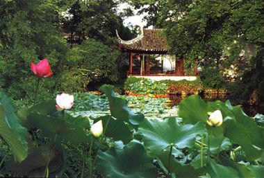( 4)園林景觀,花木為勝。拙政園向以“林木絕勝”著稱。數(shù)百年來一脈相承,沿襲不衰。早期王氏拙政園三十一景中,三分之二景觀取自植物題材,如桃花片,“夾岸植桃,花時望若紅霞”;竹澗,“夾澗美竹千挺”,“境特幽回”;瑤圃百本,花時燦若瑤華。”歸田園居也是叢桂參差,垂柳拂地,“林木茂密,石蘚然”。每至春日,山茶如火,玉蘭如雪。杏花盛開,“遮映落霞迷澗壑”。夏日之荷。秋日之木芙蓉,如錦帳重疊。冬日老梅偃仰屈曲,獨傲冰霜。有泛紅軒、至梅亭、竹香廊、竹郵、紫藤塢、奪花漳澗等景觀。至今,拙政園仍然保持了以植物景觀取勝的傳統(tǒng),荷花、山茶、杜鵑為著名的三大特色花卉。僅中部二十三處景觀,百分之八十是以植物為主景的景觀。如遠(yuǎn)香堂、荷風(fēng)四面亭的荷(“香遠(yuǎn)益清”,“荷風(fēng)來四面”);倚玉軒、玲瓏館的竹(“倚楹碧玉萬竿長”,“月光穿竹翠玲瓏”);待霜亭的桔(“洞庭須待滿林霜”);聽雨軒的竹、荷、芭蕉(“聽雨入秋竹”,“蕉葉半黃荷葉碧,兩家秋雨一家聲”);玉蘭堂的玉蘭(“此生當(dāng)如玉蘭潔”);雪香云蔚亭的梅(“遙知不是雪,為有暗香來”);聽松風(fēng)處的松(“風(fēng)入寒松聲自古”),以及海棠春塢的海棠,柳陰路曲的柳,批把園、嘉實亭的批把,得真亭的松、竹、柏等等。