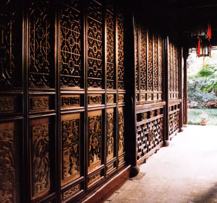 留聽閣:為單層閣,體型輕巧,四周開窗,閣前置平臺,是賞秋荷聽雨的絕佳處。閣內(nèi)最值得一看的是清代銀杏木立體雕刻松、竹、梅、鵲飛罩,刀法嫻熟,技藝高超,構(gòu)思巧妙,將“歲寒三友”和“喜鵲登梅”兩種圖案柔和在一起,是園林飛罩中不可多得的精品.