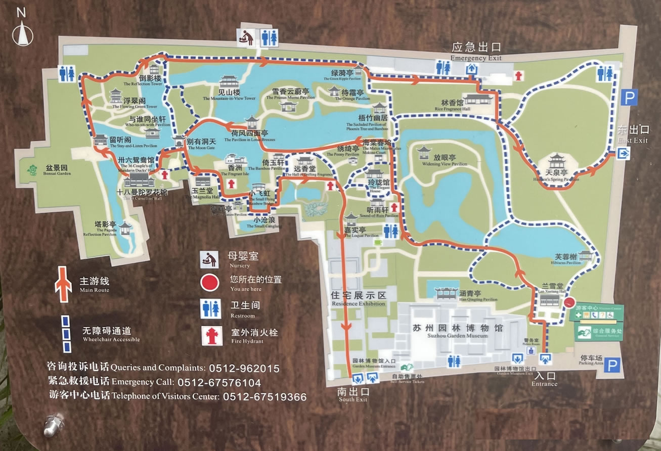 全園分東、中、西三部分?傮w布局特點,東疏西密,綠水環(huán)繞,水面面積約占全園面積1/3,水是全園的紐帶和靈魂。東部地勢空曠,平崗草地,竹塢曲水,芙蓉樹、天泉亭等亭閣點綴其間。蘭香堂是東部主廳,廳中部屏門南側(cè)為漆雕《拙政園全景圖》,把全園景色融于一壁。中部以遠(yuǎn)香堂為主體,山水明秀,廳榭典雅,花木繁茂,是全園的精華所在。從東部進(jìn)入中園,一泓清池映入眼簾,古樹,垂柳拂水,湖石峻秀。遠(yuǎn)處一洞隱約可見。池南廳堂林立,錯落有致。池北巖島,溪橋相連,百年楓楊。