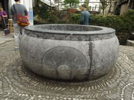 北斗七星井位于江西省上饒市婺源縣江灣鎮(zhèn)江灣景區(qū)內(nèi),北斗七星井體現(xiàn)了”天、地、人合一”的中國風(fēng)水學(xué)最高原則,南側(cè)梨園河呈太極圖“S”形系。北宋初年,南唐國師何令通遭貶來到江灣靈山隱居,與蕭江六世祖江文采交往甚篤,便指引蕭江氏族人由旃坑遷居風(fēng)水寶地云灣(現(xiàn)為江灣)。蕭江先祖在他的指引下,利用風(fēng)水學(xué)的最高原理,對江灣的水系環(huán)境、建筑布局、街衢走向,山脈走勢等方面進行了改造。族人自遷云灣后人丁日益興旺、科第舉發(fā),其中村內(nèi)的北斗七星井便是國師運用風(fēng)水學(xué)的典范。 中國古代的四個方位分別是“前朱雀后玄武、左青龍右白虎”,而江灣的地勢是玄武(后龍山)偏低,朱雀(對面攸山)偏高,朱雀屬火,也就是說南方火勢較旺,是一個較為不利的地形。當(dāng)時何令通便想出在村中挖七口井,并按北斗七星狀分布,以七井之水鎮(zhèn)住攸山火勢。而北斗七星分布又是呈勺子狀的,從此,村內(nèi)即有了充足水源又有了舀水的勺子,攸山之火自然就被鎮(zhèn)住了。