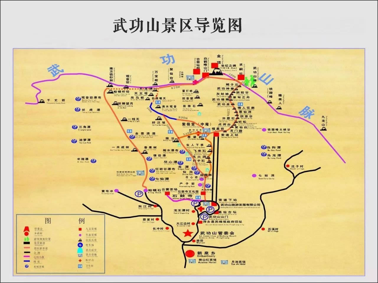 三級(jí)景點(diǎn):玉屏巖、蛤蟆觀天、紗帽石、和尚坐禪、天王塔、蛤蟆聽經(jīng)、掛榜石、十八石梯、鐵蹄峰、雷打峽、大峽谷、鐵欄關(guān)虎、龍王潭、一木成林、迎客松、千年銀杏、山茶走廊。