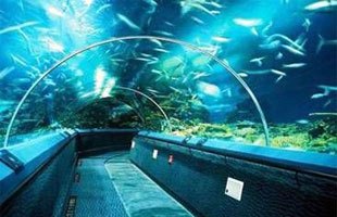 游人通過長廊猶如深入海底,四面都是海水,海底世界中神奇迷離的海底景觀將圍繞在您的上方和四周。300多種,1萬多尾海洋魚類以及身穿彩服像美人魚一樣的潛水員在您的頭頂和身旁游來游去。還有迷人的珊瑚叢、形態(tài)各異的礁石、飄來飄去的海草等海景,仿佛觸手可及。