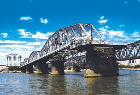 鴨綠江斷橋?yàn)轼喚G江上諸多橋中第一座橋,由日本朝鮮總督府鐵道局所建。1909年5月動(dòng)工,1911年10月竣工。1950年11月,被美國空軍炸斷。戰(zhàn)后中方一側(cè)所剩四孔殘橋一直保留,被習(xí)慣上稱為“斷橋”,朝方一側(cè)則把所屬六孔和中方剩余兩孔殘橋拆除,僅存橋墩。