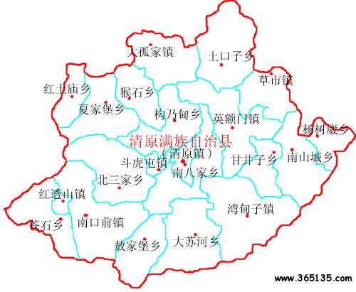 鎮(zhèn):清原鎮(zhèn)、紅透山鎮(zhèn)、草市鎮(zhèn)、英額門(mén)鎮(zhèn)、南口前鎮(zhèn)、南山城鎮(zhèn)、灣甸子鎮(zhèn)、大孤家鎮(zhèn)、夏家堡鎮(zhèn)