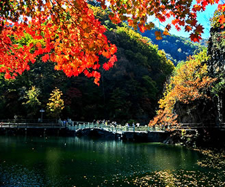 關(guān)門山是以楓葉著稱的,楓葉多得讓你數(shù)不過來,美得讓你感覺像是走進(jìn)了仙境,紅得是一團(tuán)大火焰。這里的楓葉一片綴連著一片,一株綴連著一株,像火焰,像扇子,形態(tài)萬千,千姿百態(tài)。關(guān)門山的楓葉不僅美麗,而且山也是那般雄偉,水也是那般清澈。