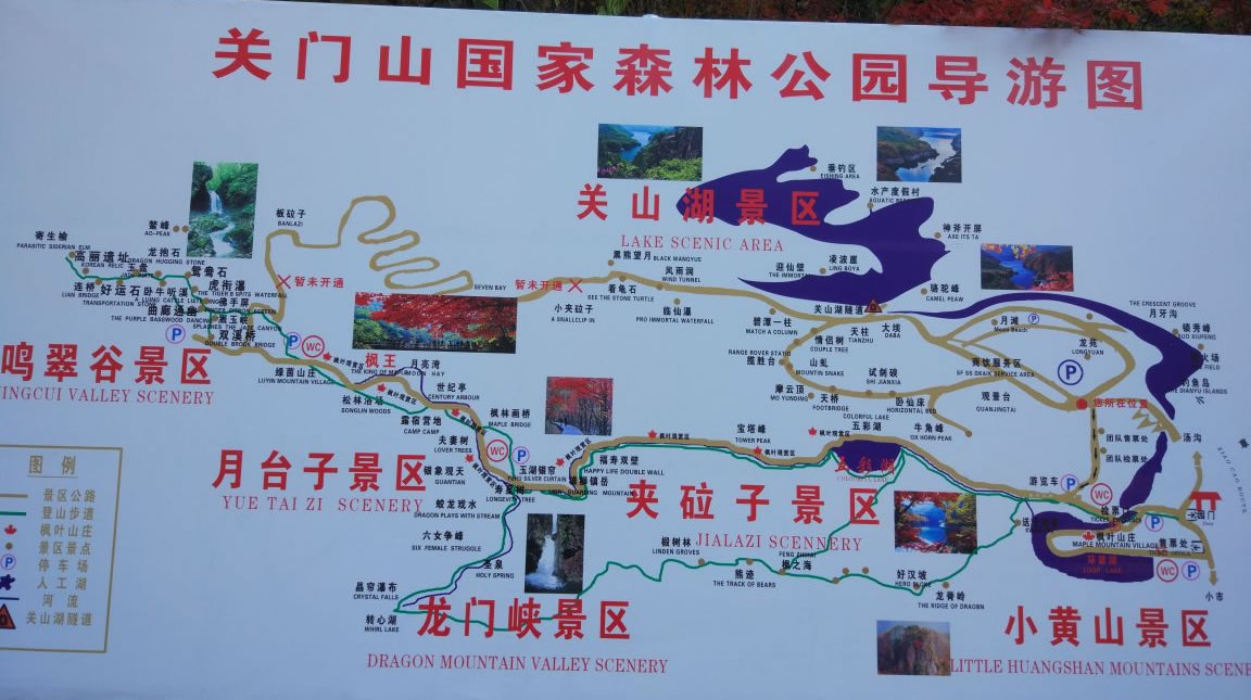 森林公園內(nèi)有四大景區(qū)小黃山景區(qū)、夾砬子景區(qū)、龍門峽景區(qū)和月臺子景區(qū),共計(jì)108處景點(diǎn)。它有三道門:北門,在小市方向,雙峰對峙,中間拱橋相連;南門,在去湯溝的嶺頂,公路從中穿過,十分險(xiǎn)要;中門,在深谷河道中,“雙扉”夾水,寬只二十余米,為興修水庫的天然門柱,有人把關(guān)門山風(fēng)景譽(yù)為“小江南”,“賽黃山”,說它有五美:山美,陡峭,俊秀,似一簇簇盆景;樹美,樹木種類繁多,特別是秋天的楓葉,冬季植根于峭壁上的蒼松,非常壯觀;水美,湯河穿過山谷,匯集小溪,飛瀑,“奪門”而出,似來自于天際;花美,天女木蘭,山杜鵑,漫山遍野;云美麗,清晨雨后,山谷中云霧繚繞,如披輕紗,分外嫵媚。歷代文人多有詩篇贊頌,許多美術(shù)工作者,經(jīng)常到這里寫生、作畫。