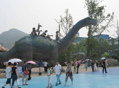 侏羅紀(jì)激流探險,總占地面積8600平方米,以一種時空穿插的景觀設(shè)計手法,將五種八只侏羅紀(jì)時期的恐龍置身于虛幻的遠(yuǎn)古村落中。載客古船,沿210米長,15米高的水道激流急下,沿途中,一只高9米,長19.8米,重約8噸的亞洲最大的機(jī)械恐龍“巨無霸”,不時的向沖刺在激流中的游人搖頭擺尾,吼叫或噴水,載客古船激起的25米高的巨浪。 旅游船