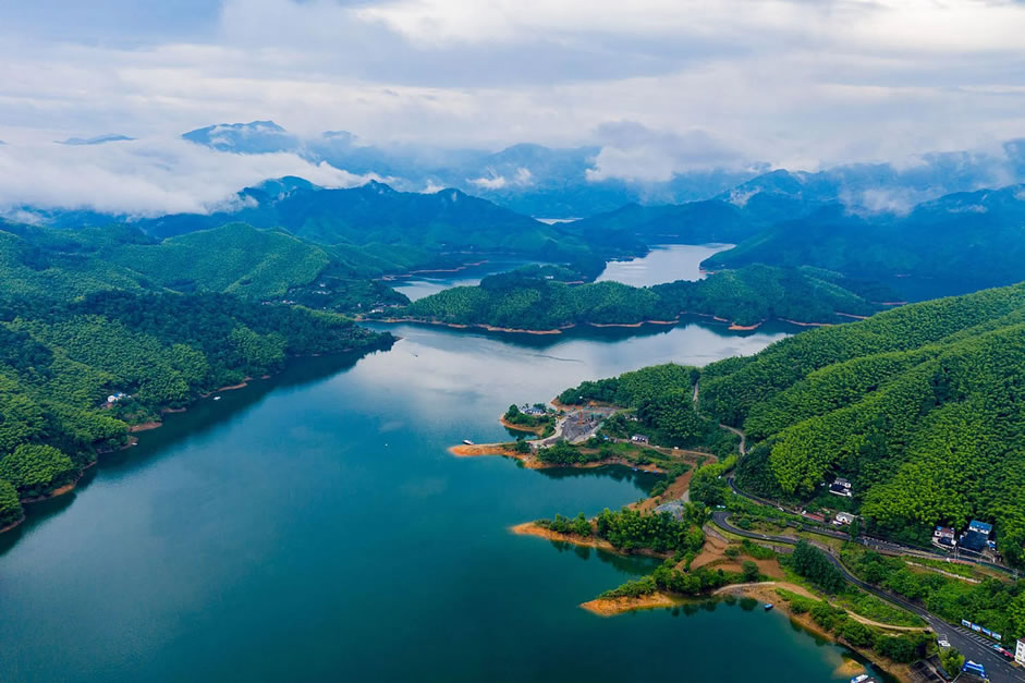 九龍湖風(fēng)景區(qū),位于浙江省寧波市鎮(zhèn)海區(qū)九龍湖鎮(zhèn)境內(nèi),原為慈溪縣(今慈城)河頭鄉(xiāng)河頭市,距慈溪老縣城(慈城)約15公里,距寧波市中心約20公里。十字路水庫,別名九龍湖,水庫位于達蓬山以南,處于姚江流域,水域面積3平方公里,始建于1977年,1979年建成,包含九龍湖水庫、小洞岙水庫、郎家坪水庫和三圣殿水庫四個水庫,是鎮(zhèn)海區(qū)飲用水源地,國家4A級旅游景區(qū)。湖周黛峰如眉,翠嶺逶迤;湖中碧波如鏡,嵐影倒懸。波光藍天一色,綠樹修竹相映,景色極為旖旎。湖北側(cè),九龍山偉岸挺拔,九個山頭和九條山脊并列一起,猶如九條臥龍伏地,綿亙數(shù)里,九龍山和九龍湖之名,皆藉此而來。時人有“九龍盤青山,松竹映碧波”的詩句,描述九龍山和九龍湖的景致。湖東北,是大蓬山,亦名達蓬山,海拔315米,山勢崢嶸,崖巖危突,登頂可眺望東海。