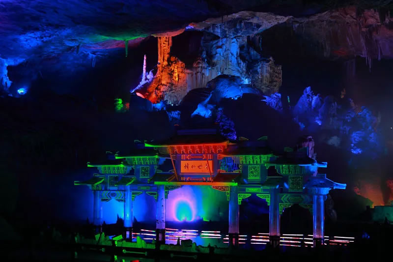 - 特色:洞內(nèi)分為七個(gè)洞廳,前四廳為自然景觀(guān),展示石筍、石幔、石花等形態(tài)各異的鐘乳石;后三廳為人工打造的“神仙世界”游樂(lè)宮,結(jié)合聲、光、電技術(shù),展現(xiàn)奇幻的溶洞世界。