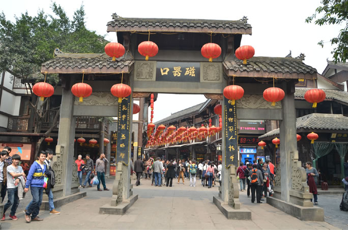 磁器口古鎮(zhèn),原名白巖場,也稱龍隱鎮(zhèn),地處重慶市沙坪壩區(qū)東北部,嘉陵江畔磁南街1號。北距沙坪壩中心5千米,重慶市中心14千米,南距石井坡3千米。古鎮(zhèn)總面積32.5萬平方米,景區(qū)核心面積分布于馬鞍山東側和東南側,有14.3萬平方米。磁器口古鎮(zhèn),始建于宋真宗咸平年間,在清朝及民國時期得到飛速發(fā)展;1958年后,隨著水運交通逐漸蕭條,古鎮(zhèn)日漸衰落;20世紀末,憑借古鎮(zhèn)旅游潮流,磁器口古鎮(zhèn)又再次得到發(fā)展。它是重慶主城區(qū)內唯一的規(guī)模最大、最具巴渝傳統民居、民俗、民風特色的古鎮(zhèn)。古鎮(zhèn)上傳統的民居建筑、石梯街巷、遺存的寺廟宮觀,是巴渝山地民居建筑的天然博物館。磁器口古鎮(zhèn)依山而建,由山起城。以磁器口正街和橫街為骨架,42條巷道垂直于正街和橫街向馬鞍山脊和溪溝邊緣呈枝狀發(fā)展,形成特征明顯的樹枝狀平面格局。古鎮(zhèn)的主要景點有翰林院、鐘家院、寶善宮、寶輪寺、黃桷坪牌坊等。