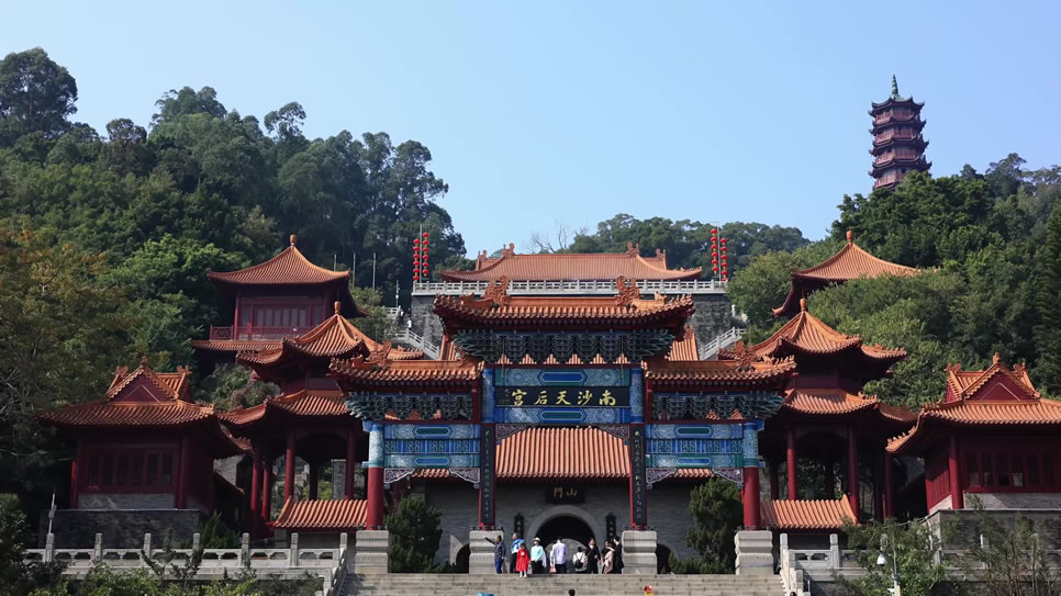 廣州南沙天后宮,又叫“媽祖廟”,位于廣東省廣州市南沙區(qū)天后路88號,坐落于大角山東南麓,地處粵港澳大灣區(qū)之心,瀕臨珠江出海口的伶仃洋,占地面積達18萬平方米。廣州南沙天后宮前身是明代建于鹿頸村的天妃古廟,清乾隆年間經重修定名為元君古廟,抗戰(zhàn)時期被日寇飛機炸毀,而后于1994年重建。廣州南沙天后宮是為紀念海上女神林默而建,是一個以媽祖文化為主題的景區(qū),是粵港澳大灣區(qū)媽祖文化交流中心,亦是東南亞最大之媽祖廟。廣州南沙天后宮采用清式建筑對稱布局,高低錯落地依山而建,建筑的特點集北京故宮的風格和南京中山陵的氣勢于一體,規(guī)模為現(xiàn)今世界同類建筑之最。廣州南沙天后宮由廣場、宮殿和南嶺塔三部分構成,“天后八景”包括:濱海銀灘朝陽、五彩靈徑、媽祖靈釵、“南沙人”遺址、靈宮賜福、南嶺夕照、抗戰(zhàn)神炮、默娘之家八個景點。