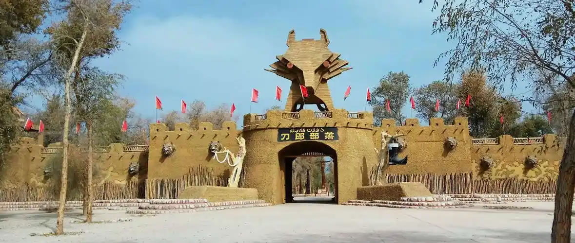 刀郎部落,位于新疆維吾爾自治區(qū)阿克蘇地區(qū)阿瓦提縣玉滿閘口胡楊林區(qū),距阿克蘇市58公里、縣城18公里,占地面積8300畝。景區(qū)以5000余畝千年原始胡楊林為生態(tài)背景,完整呈現(xiàn)刀郎人建筑、飲食及民俗文化,集中展示刀郎木卡姆、刀郎麥西熱甫等8項國家級和自治區(qū)級非物質(zhì)文化遺產(chǎn),其中“刀郎演唱組合”保持著最大年齡民間歌舞組合的大世界基尼斯紀(jì)錄。核心功能區(qū)包含民俗展館、千年胡楊區(qū)、鴕鳥養(yǎng)殖園區(qū)等七大板塊,復(fù)原刀郎人傳統(tǒng)居所與勞作工具,設(shè)有傳統(tǒng)手工藝作坊和勇士競技場,每日開展刀郎麥西熱甫展演、民俗婚禮體驗及摔跤、叼羊等傳統(tǒng)體育活動。2025年入選非遺進(jìn)景區(qū)“五好”案例名單,通過非遺傳承人駐場表演、慕薩萊思釀造工藝展示及沙雕主題公園等特色項目,形成生態(tài)觀光與民俗體驗深度融合的旅游模式。景區(qū)內(nèi)保留狩獵場景、農(nóng)民畫長廊及高空輪轉(zhuǎn)秋千表演,配套沉浸式互動體驗和文創(chuàng)開發(fā)體系,實現(xiàn)刀郎文化的活態(tài)傳承。