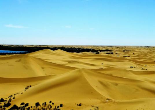 庫布齊沙漠,是中國第七大沙漠,在河套平原黃河“幾”字彎里的黃河南岸(有的人稱河套沙漠),往北是陰山西段狼山地區(qū)。“庫布其”為蒙古語,意思是弓上的弦,因?yàn)樗幵邳S河下像一根掛在黃河上的弦。古稱“庫結(jié)沙”、“破訥沙”,亦作“普納沙”。庫布齊沙漠是距北京較近的沙漠。位于鄂爾多斯高原脊線的北部,內(nèi)蒙古自治區(qū)鄂爾多斯市的杭錦旗、達(dá)拉特旗和準(zhǔn)格爾旗的部分地區(qū)。長(zhǎng)400公里,寬50公里,總面積約1.39萬平方公里,流動(dòng)沙丘約占61%,沙丘高10~60米,像一條黃龍橫臥在鄂爾多斯高原北部,橫跨內(nèi)蒙古三旗。形態(tài)以沙丘鏈和格狀沙丘為主。