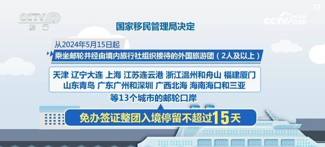 2024年5月15日起,乘坐郵輪并經(jīng)由境內(nèi)旅行社組織接待的外國(guó)旅游團(tuán)(2人及以上),可從天津、遼寧大連、上海、江蘇連云港、浙江溫州和舟山、福建廈門(mén)、山東青島、廣東廣州和深圳、廣西北海、海南?诤腿齺喌13個(gè)城市的郵輪口岸免辦簽證整團(tuán)入境停留不超過(guò)15天。旅游團(tuán)須隨同一郵輪前往下一港,直至本次郵輪出境,活動(dòng)范圍為沿海。ㄗ灾螀^(qū)、直轄市)和北京市! ∴]輪旅客“靠港即下、好來(lái)快走”