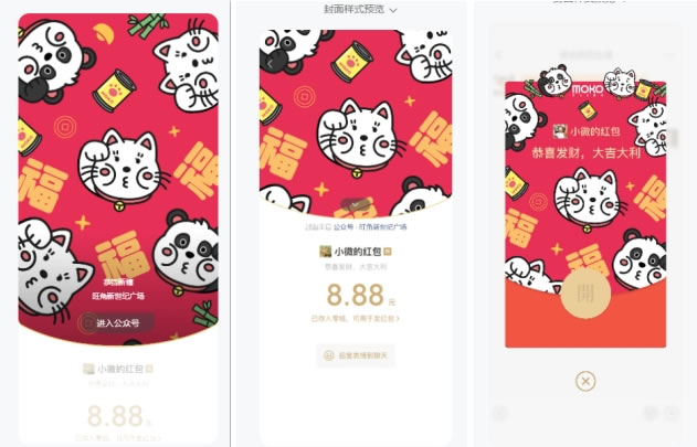 當(dāng)下微信發(fā)紅包搶紅包已成特有的新春社交儀式,據(jù)微信官方數(shù)據(jù)顯示,2024年除夕夜微信用戶(hù)共搶到微信紅包50.8億個(gè),發(fā)送拜年紅包1.9 億次,各大品牌也紛紛推出微信紅包封面,為用戶(hù)的拜年社交增添喜氣。蛇年新春,MOKO與插畫(huà)家 Cheeky Cheeky 厚面子合作,延續(xù)萌爆漫畫(huà)風(fēng),由厚面子 Cosplay 新年吉祥物招財(cái)貓和頂流大熊貓,在紅包封面上盡顯魅力。新年前分階段陸續(xù)發(fā)放1.5萬(wàn)個(gè)微信紅包封面,為今年的拜年增添滿(mǎn)滿(mǎn)萌趣,拆開(kāi)紅包的親友,不僅能解鎖MOKO超值新春旅客專(zhuān)屬福利,還能再次回味此前深受用戶(hù)喜愛(ài)的國(guó)風(fēng)熊貓視頻。