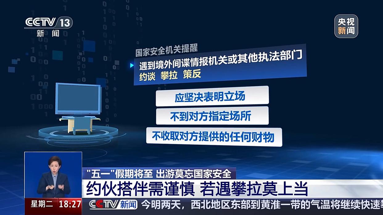 遇到境外間諜情報(bào)機(jī)關(guān)或其他執(zhí)法部門約談、攀拉、策反,應(yīng)堅(jiān)決表明立場(chǎng),不到對(duì)方指定場(chǎng)所,不收取對(duì)方提供的任何財(cái)物,不簽署任何文件,不透露任何內(nèi)部信息,堅(jiān)持要求聯(lián)系我國(guó)駐外使領(lǐng)館尋求領(lǐng)事保護(hù)。